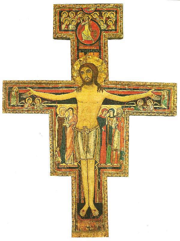 Nosso crucifixo é um hino à santidade de Deus, expressa na luz e na beleza. Um artista italiano desconhecido o pintou no século XII num pano colado sobre uma madeira de nogueira. Ele possui 2,10m de altura, 1,30m de largura e 12cm de espessura. Provavelmente o Crucifixo permaneceu na Igreja de São Damião até que as irmãs Pobres, em 1257, o levaram consigo à nova Basílica de Santa Clara.