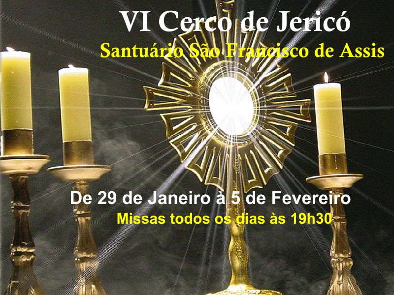 No proximo domingo, dia 29, começa o VI Cerco de Jericó aqui no Santuário. A abertura será na missa das 19h30, presidida pelo Frei Adalto Antonio - pároco e termino no domingo seguinte, dia 05 de fevereiro com a missa das19h30, presidida pelo Padre Teddy, coordenador diocesano de pastoral.